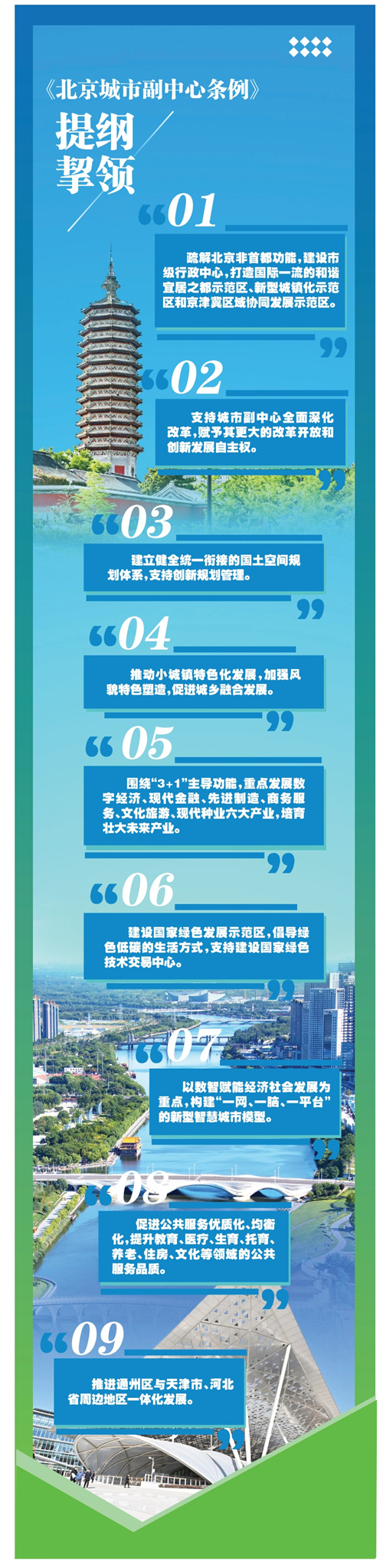 与“十五五”规划落地紧密衔接,城市副中心管委会锚定城市副中心高质量发展目标,将《条例》与年度重点工作、“十五五”规划落地实施结合起来,初步梳理形成《条例》实施2026年重点任务清单,共包括规划建设、产业发展、绿色转型、公共服务、协同发展等100余项重点任务,明确进度要求和职责分工,以清单化、项目化方式高标准推动《条例》重点任务落地实施,为“十五五”时期城市副中心发展夯实基础。