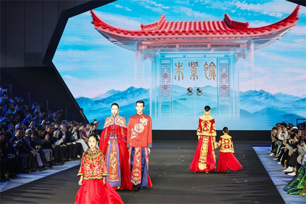 伴随着动感的鼓点,光影交织间,身着极具古典美学风格华服的模特登上T台。白、绿、青、蓝、紫等色泽的服装上,或点缀亮片宝石,或刺绣传统纹,美感十足。记者了解到,这场开幕大秀的主题为“华服双章”,由尚仄国际携旗下“六礼”与“朱紫褕”服装品牌呈现,80套服装在模特的演绎下,完成了一场中华服章之美的创新表达。