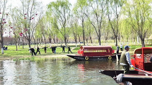 活动现场,运河故道春意盎然,嫩柳垂绦、碧波荡漾,木质步道与花景装置相映成趣,成为市民漫步赏春的好去处。岸边浅滩处,孩子们嬉水逐鱼,笑声不断;朱红摇橹船轻泛水面,橹声悠扬,勾勒出一幅水城相融的诗意画卷。天幕市集里,糖画、面人、剪纸等非遗技艺集中亮相,老艺人巧手生花,吸引不少市民驻足围观、亲身体验;非遗秧歌彩绸翻飞、锣鼓铿锵,传统民俗在春光里焕发生机。大家或坐赏民乐、或打卡国风场景、或品尝特色美食,在一步一景中感受副中心的生态魅力与烟火温度。