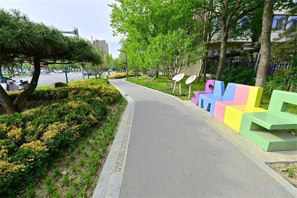 通州区妇幼保健院门口的改造,是本次项目的重点民生节点。长期以来,该院区门口仅有简单绿化,面对巨大的人流量和密集的排队人群,缺乏必要的缓冲休息区域,拥堵杂乱成为常态,既影响市民就医体验,也让周边街巷少了春日生机。此次改造精准施策,重点规范非机动车停放秩序,充分利用原有绿地嵌入口袋公园,增设休憩互动设施,公园道路采用塑胶软性铺装,既提升了安全性与舒适度,更以绿植点缀、繁花相映,丰富绿化层次,打造出兼具实用性与观赏性的春日休息小筑,彻底扭转拥堵杂乱局面,让市民就医等候期间,既能休憩放松,也能欣赏街巷春景,让副中心的春意浸润每一个民生细节,让就医之路也成为赏景之路。
