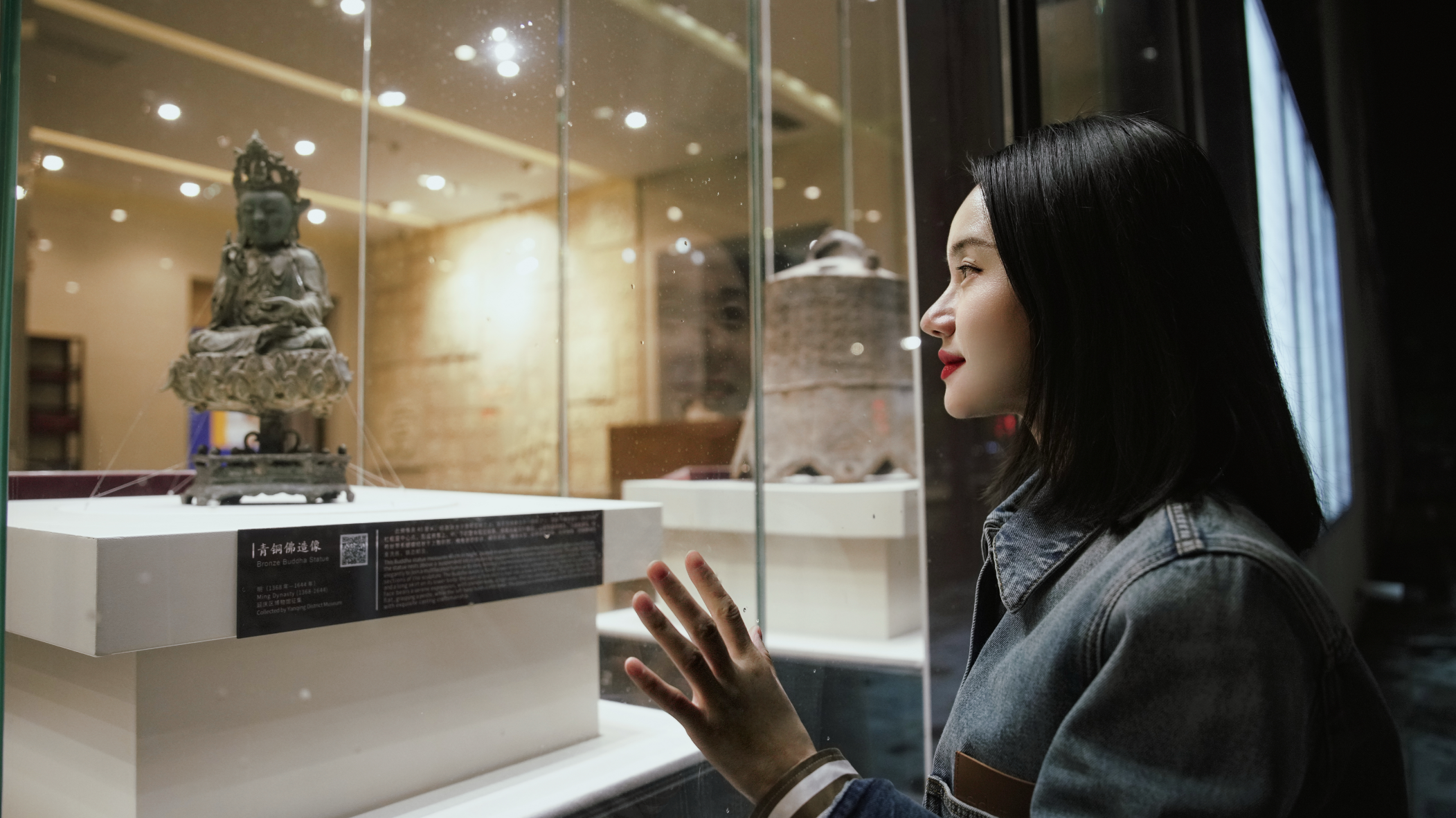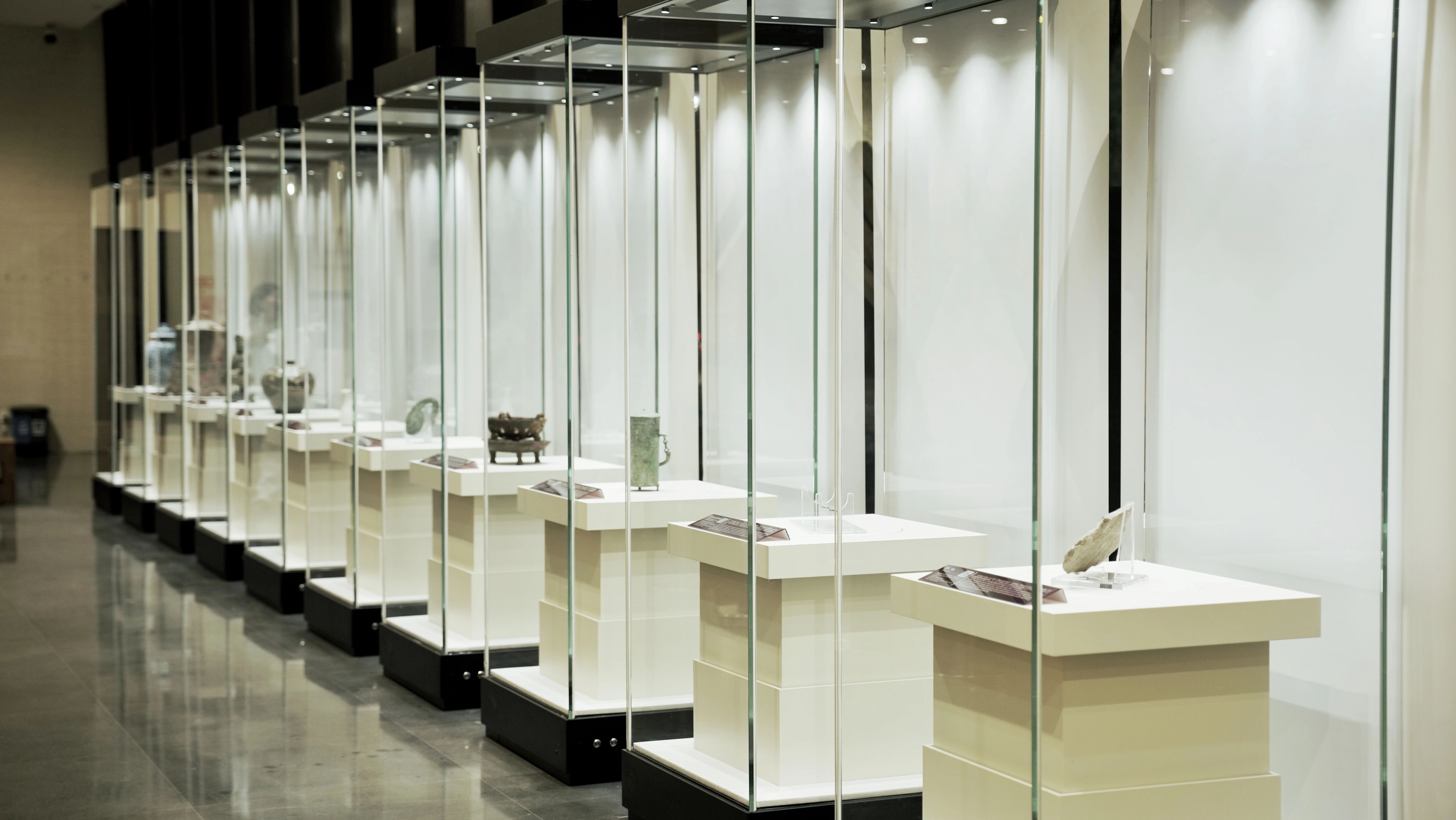 为兼顾文物安全与观展体验,展览在细节设计上“双管齐下”,科技感与人文关怀拉满。10件文物均安置在定制款独立展柜中,展柜采用高透低反玻璃,搭配可升降、360°旋转展台,观众能全方位看清文物纹路与细节。玻璃幕墙选用高透光防爆材质,既保证观赏清晰度,又为文物筑起“防护盾”。考虑到日光对文物的影响,展区配备了自动遮光帘,白天降下以隔绝紫外线,为文物营造适宜的保存环境;太阳下山后,遮光帘自动升起,文物在特制的展柜灯光下熠熠生辉,实现了“保护”与“观赏”的双向平衡。