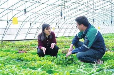 产业的健康发展,离不开技术人员的“把脉问诊”。区农业农村局专业技术人员定期深入铂林农业的大棚,开展“点对点”跟踪式服务。“目前棚内温度回升快,要特别注意控制浇水量和温湿度,预防白粉病和蚜虫。”在立体栽培架前,技术人员仔细查看乌塌菜根系,现场讲解水肥管理要点,帮助企业解决生产难题。