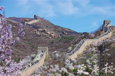 春日的八达岭长城,山花漫坡,风拂城垣,更显雄奇壮阔。前来登城赏花的游客在此拍照打卡,感受长城春日胜景。来自北京市区的游客杨帆说:“早就听说八达岭长城的杏花特别美,今天特意来游览,一边是雄伟的长城,一边是盛开的杏花,景色特别震撼,氛围感十足。”