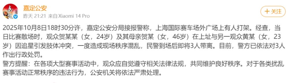 追星江湖,再现荒唐一幕。10月8日,2025年上海8小时耐力赛上海国际赛车场外广场上,竟然有人打架。据上海嘉定公安分局10月9日通报,当日比赛散场时,观众贺某某(女,24岁)及其母亲贺某(女,46岁)与另一观众黄某(女,23岁)因追星引发肢体冲突,警方已依法对3人作出行政处罚。