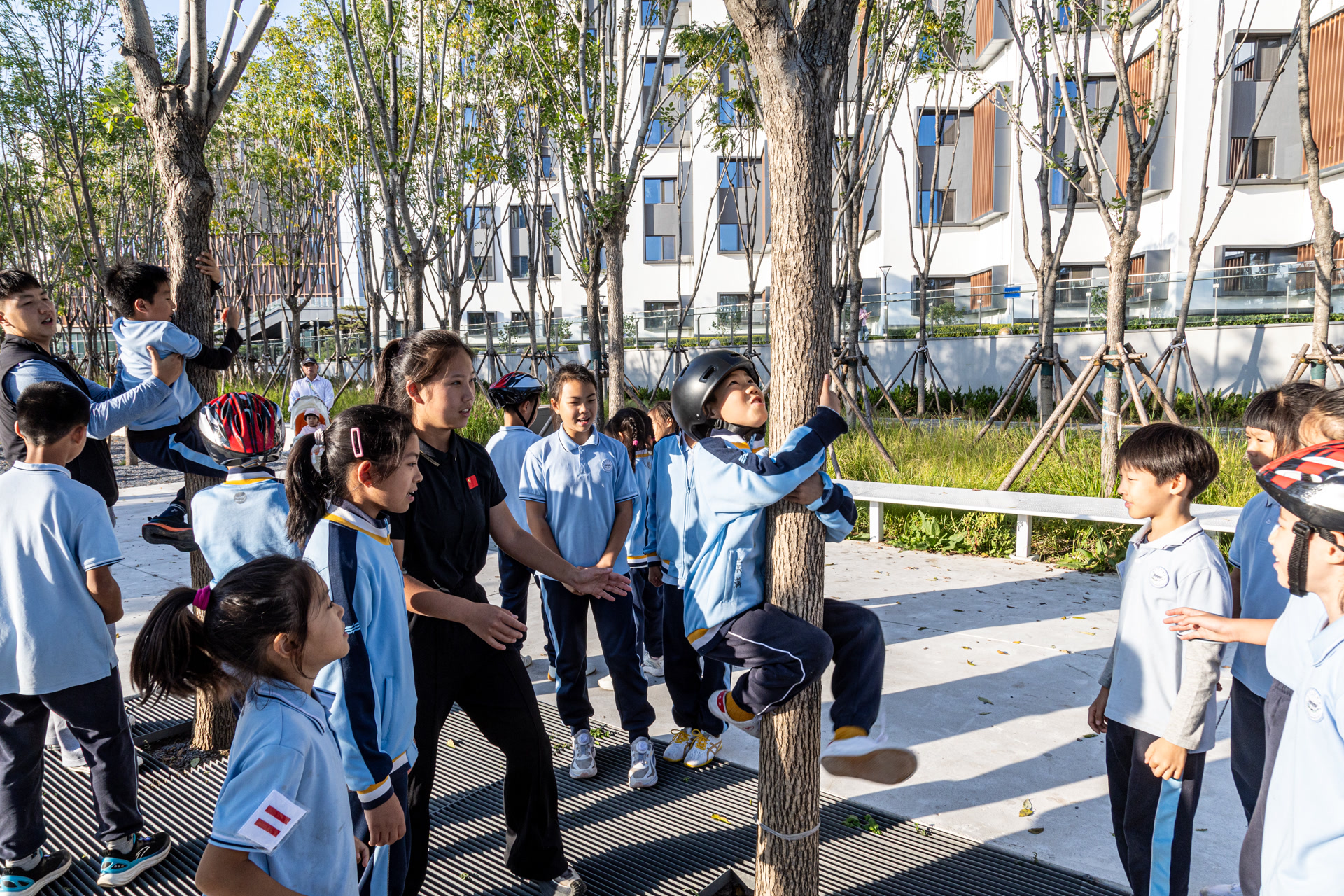 秋日午后,在同学们此起彼伏的加油声中,一名学生噌噌爬上两米多高的树杈……充满童趣的“爬树课”,在凉水河南中轴段绿地里上得热火朝天。