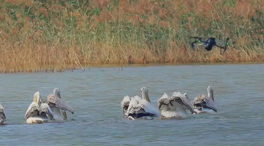 2025年9月,东营黄河口湿地,低飞的无人机正在靠近国家一级重点保护野生动物卷羽鹈鹕。图据中国新闻周刊