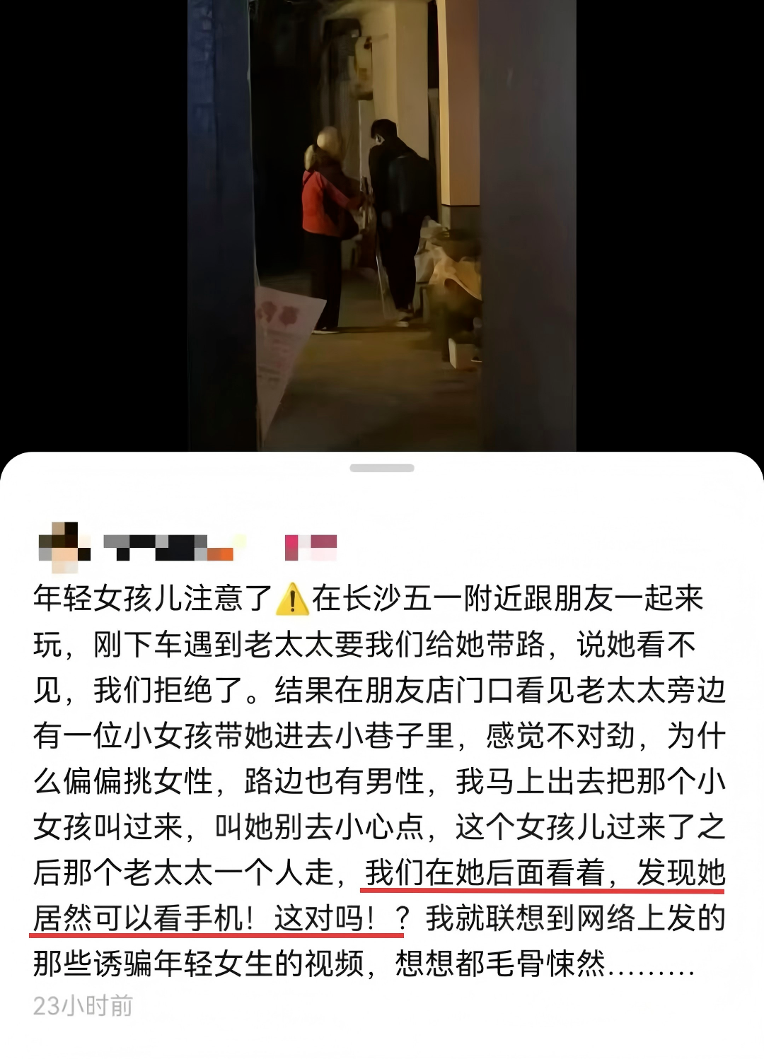 女子对自我的保护、对风险的警惕,无需苛责。但大胆发声前,必须小心论证。或上网查查盲人如何“看”手机,或去盲人老太太所在社区问问情况,或给警察拨一通求助电话,就能阻止谣言产生。未经核实的提醒,脱离了善意的初衷,为后续一些人过度脑补、恶意揣测,提供了口实。