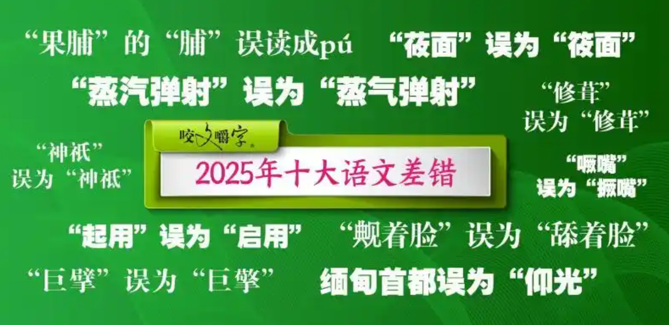 《咬文嚼字》编辑部日前发布2025年十大语文差错。从今年榜单看,入选词汇基本出自社会热点新闻事件的描述中。比如,直播带货时,一些主播将“果脯”的“脯”错读为pú,其实在表示干制果肉时应读fǔ;《哪吒之魔童闹海》的一些影评中,“神祇”被误写为“神祗”,一点之差音义却相去甚远……