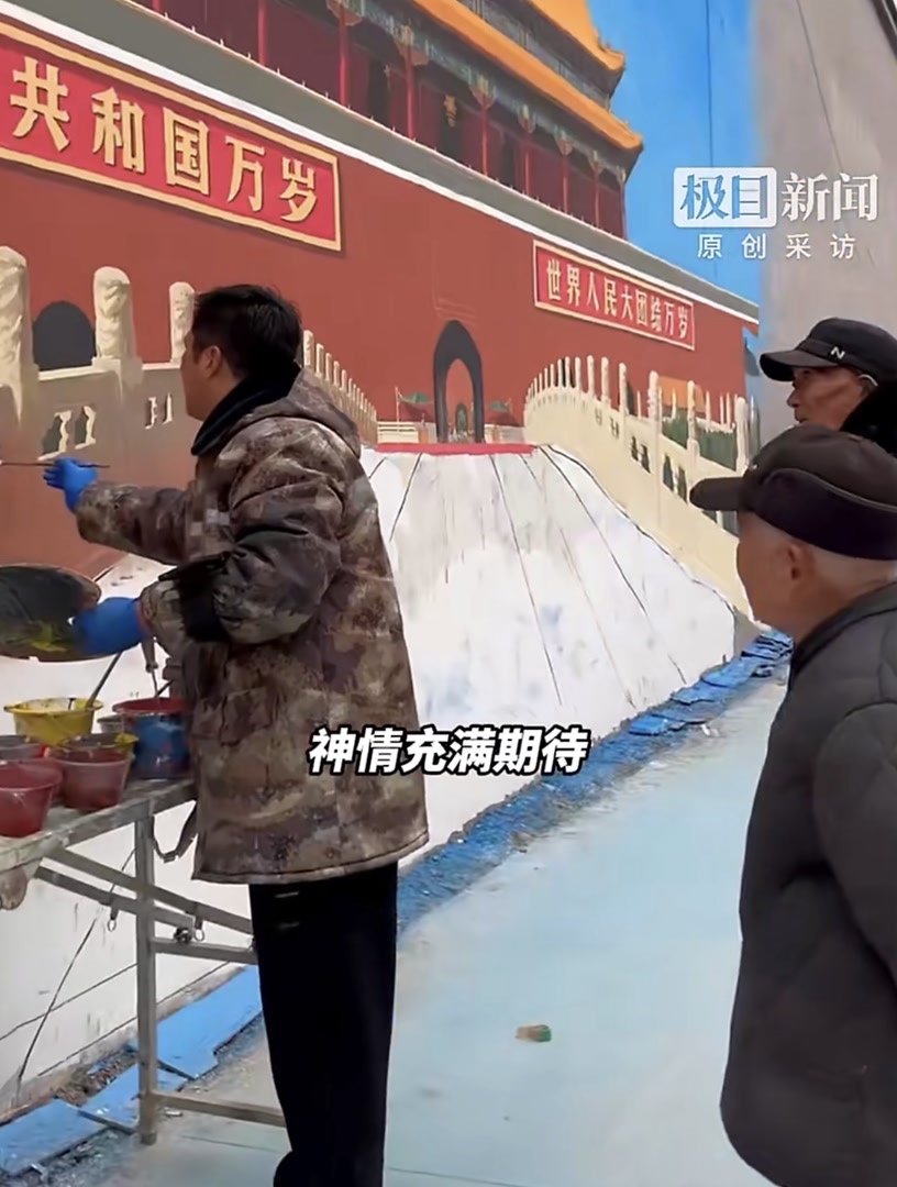 “老人看到面前的‘天安门’,忍不住抹了眼泪,他说今年的愿望完成了。”在河南商丘吴营村,青年画家吴承言画出18米长、8米高的巨幅天安门墙绘。连日来,很多没去过北京的当地老人到这里拍照圆梦,还有游客专程前来打卡。