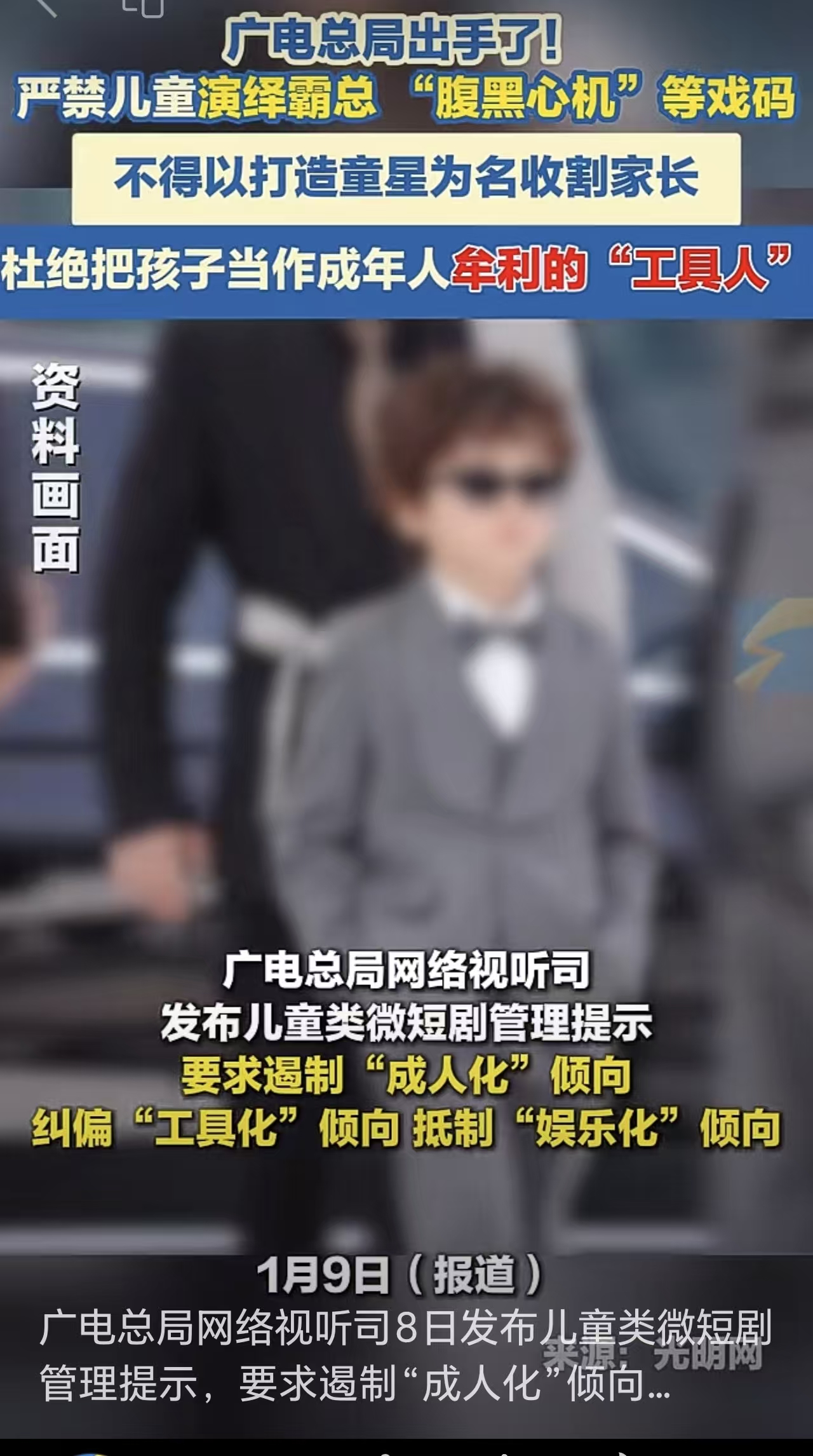 扎根儿童生活,尊重成长规律,遏制“成人化”倾向;坚决杜绝把儿童当成满足成年人一夜暴富幻想、情绪代偿或流量收割的“工具人”。1月8日,广电总局发布《管理提示(儿童类微短剧)》,针对近期以“萌娃”“亲子”为标签的儿童类微短剧创作中出现的“成人化”“工具化”“娱乐化”等不良倾向,提出明确规范要求。