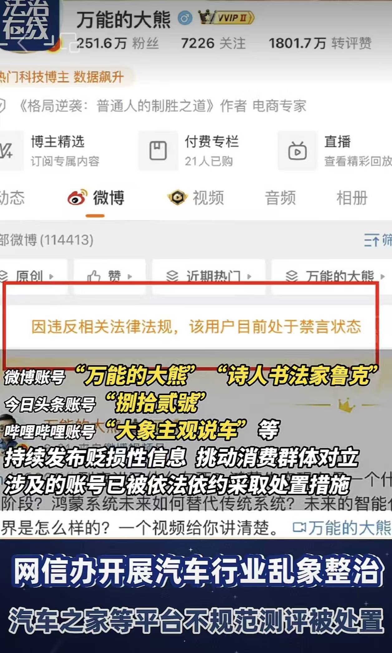 据“网信中国”微信公众号1月16日消息,国家网信办会同工信部等部门聚焦挑动群体对立、炒作负面话题、开展不规范测评等突出问题,持续深入开展汽车行业网络乱象专项整治,依法依约处置一批违法违规账号。微博账号“万能的大熊”“诗人书法家鲁克”、哔哩哔哩账号“大象主观说车”、抖音账号“胖哥试车”、微信公众号“五星评车”,“汽车之家”“太平洋汽车”等汽车类垂直平台均被点名,相关账号已被依法依约采取处置措施。