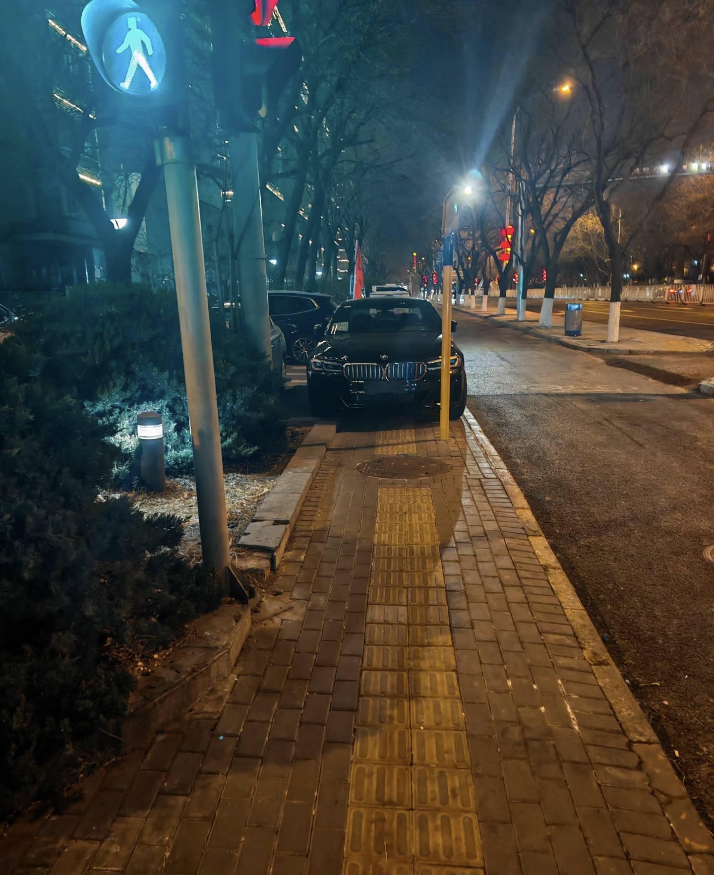 一辆贴着临牌的车违停在人行道上。图据北京日报客户端