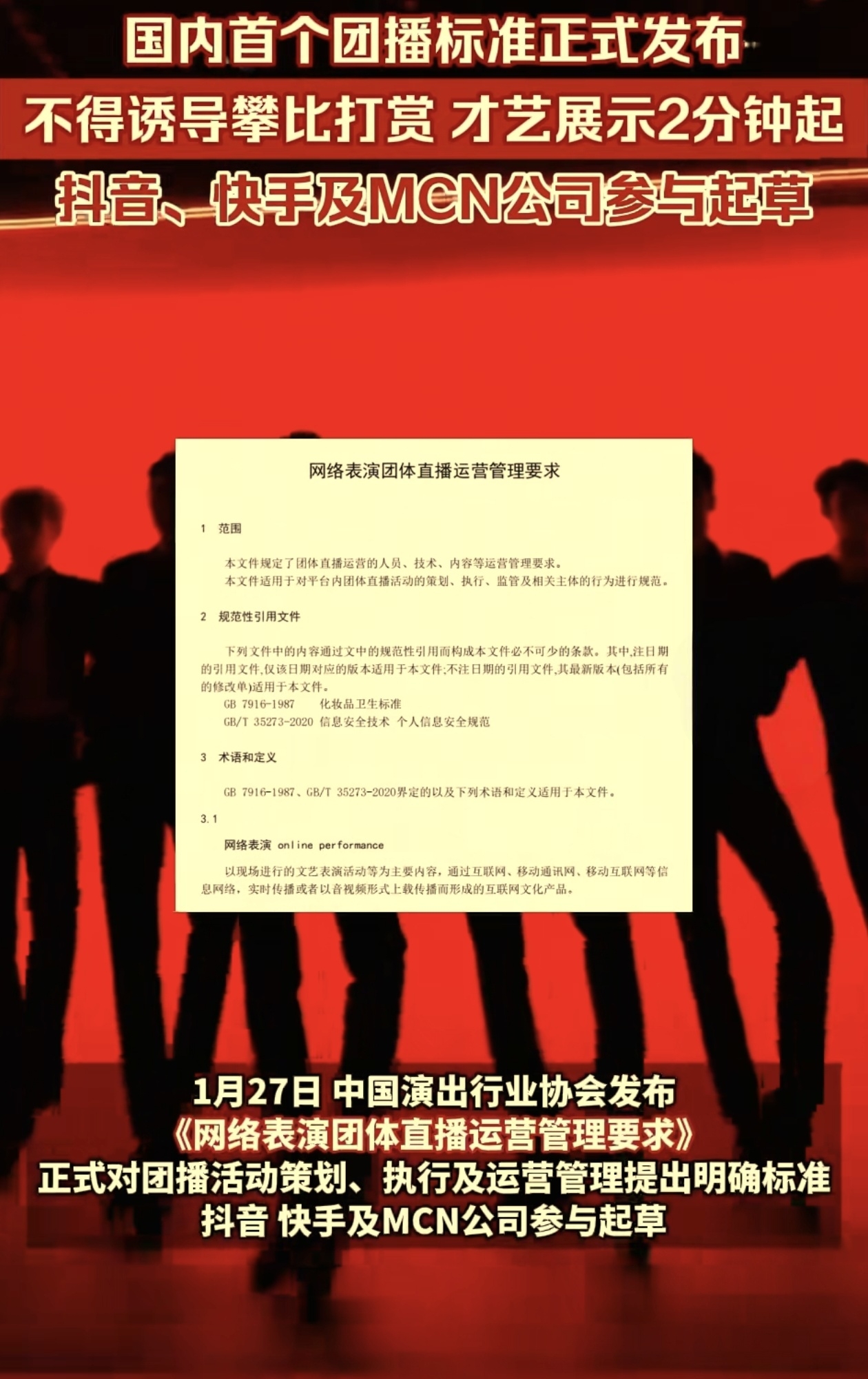 不应通过暗示性语言、动作或虚构亲密关系诱导用户消费,不应组织粉丝进行打赏排名或攀比;直播才艺表演的服化道要服装大方得体、不浓妆艳抹或过度磨皮美颜……1月27日,中国演出行业协会发布《网络表演团体直播运营管理要求》,从机构与人员、内容与技术、服化道管理、安全与保障、社会责任与诚信建设等多个维度,明确了团播运营主体的管理责任与操作规范。
