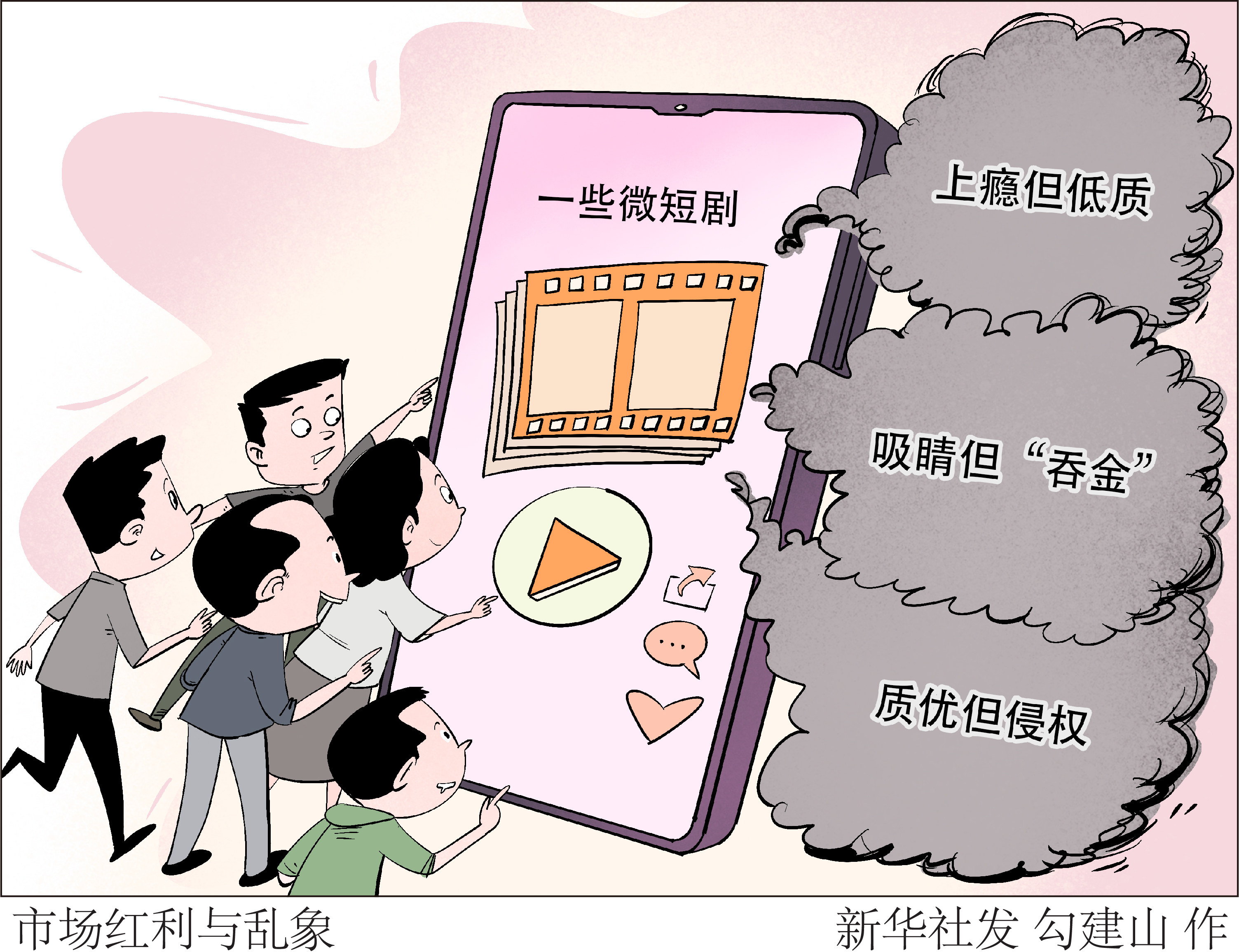 在闲暇时间里看看微短剧,对很多人来说就是图个消遣、获得一种情绪价值。也许微短剧没有太过深刻的内容、考究的画面,但剧情中的反转冲突带来的爽感常常让人欲罢不能。强刺激的剧情精准抓住了观众的情绪需求,但部分制作方为了快速吸粉变现,将爽感奉为唯一追求,忽略了内容品质与价值导向,让微短剧在爽完之后,留下了一堆亟待清理的“鸡毛”。