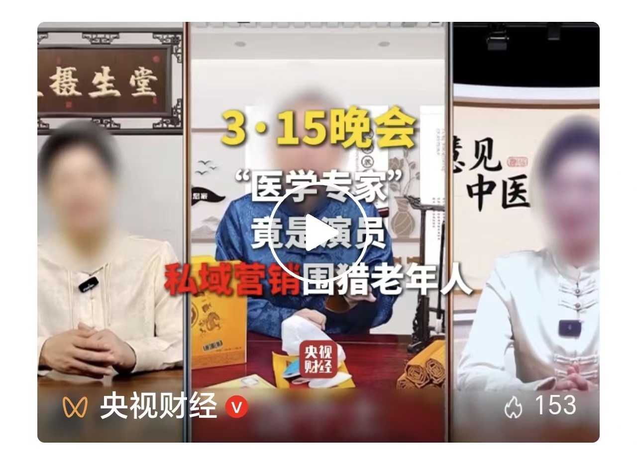 有视频制作方直言,业内都担心今年的“3·15”晚会会曝光私域,因为这个行业经不起查;不少假“专家”也都因为临近3·15晚会不敢露面。恐惧是因为心里有鬼,害怕是因为不敢面对。这些骗子比谁都清楚,他们兜售的不是健康产品,而是最多无害于健康的东西;赚取的不是合法的利润,而是老年人的养老钱、救命钱。正是对坑骗老人的恶劣行径心知肚明,才畏畏缩缩地把骗人的场地搭建到监管不易察觉的私域;知道自己游走在灰色地带,才对3·15晚会如此避之不及。
