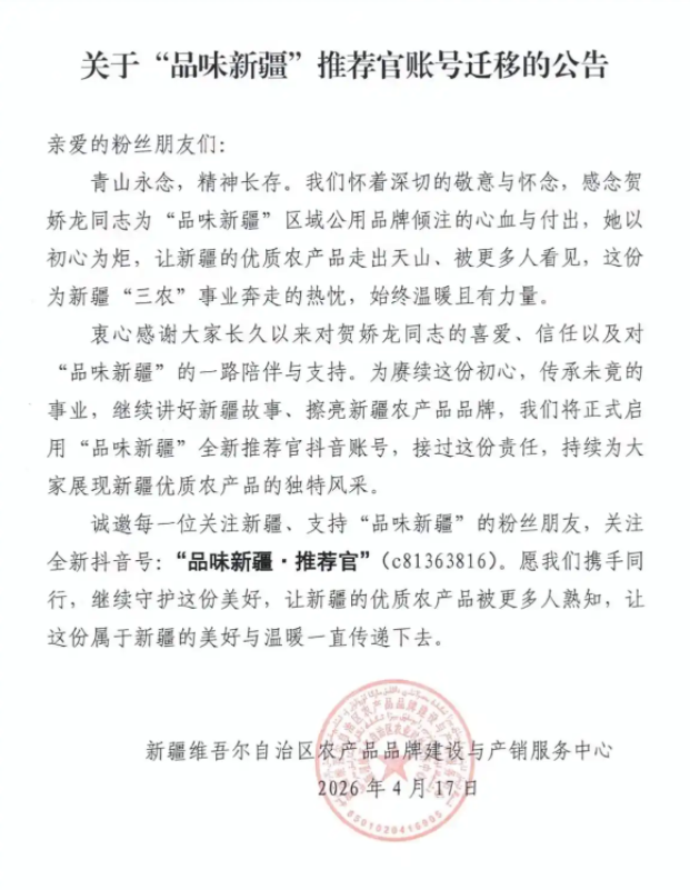 公告称,将启用全新账号,继续讲好新疆故事、擦亮新疆农产品品牌。评论区里,不少网友表达了一个朴素而深情的愿望:希望能保留贺娇龙的账号,以此纪念她的奉献。
