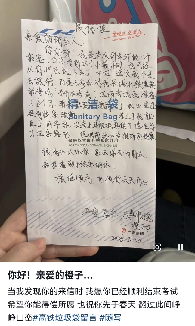 比如,有网友在高铁上看到了“前一任”乘客写在清洁纸袋上的来信,写信的陌生朋友倾诉了自己即将考试的紧张。这位网友则发帖暖心回复,“希望你能得偿所愿,也祝你先于春天,翻过此间峥峥山峦!”一场陌生人的隔空对话,字里行间都流露着温情。