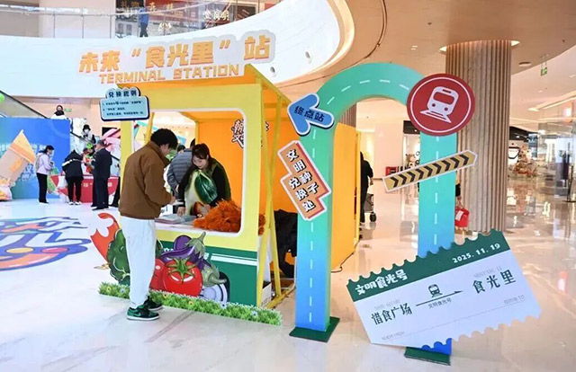 市集旁的好“荟”玩文明互动打卡区同样精彩。市民可以在这里体验一场文明“食光”列车之旅。通过小游戏解锁文明知识,每完成一项挑战就能获得一枚可爱贴纸。集齐4枚,即可在终点的“未来‘食’光里”为“文明护照”盖上象征希望的“文明种子”印章,并兑换实实在在的美食优惠券。这波操作,真正实现了“文明传递”与“商业赋能”的双向奔赴!
