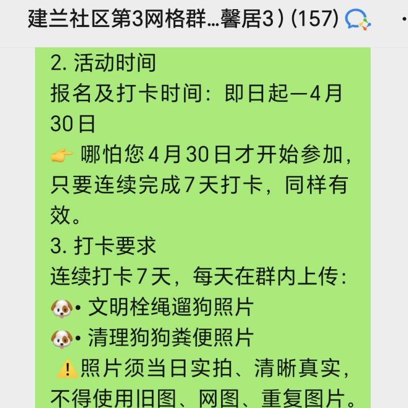 近日,为倡导文明养犬、共建整洁和谐的社区环境,建兰社区开展了“文明养犬七日打卡”活动。活动面向本社区养犬居民,要求连续7天在群内上传真实、当日的“栓绳遛狗”及“清理粪便”照片。