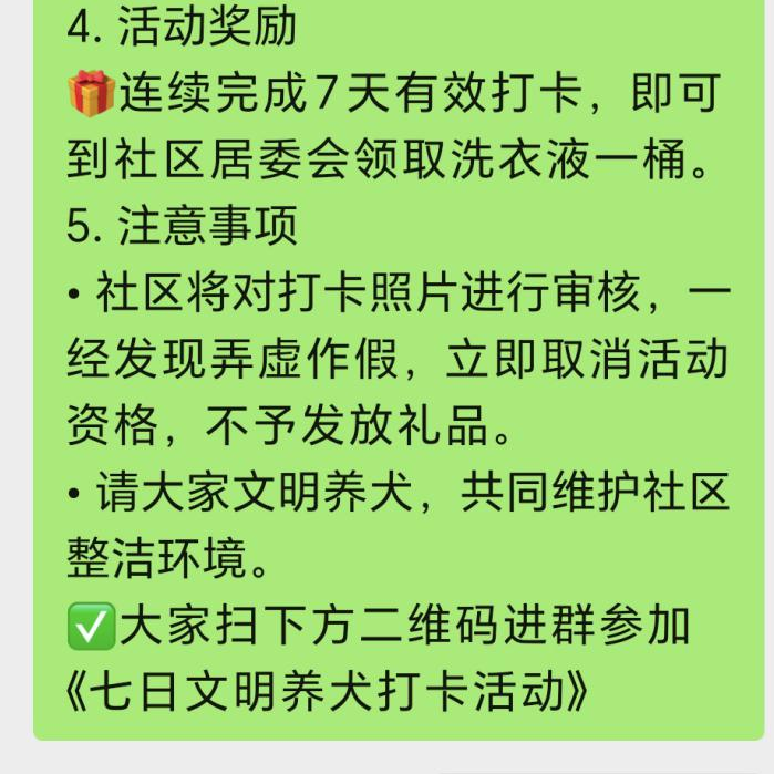 此次活动将持续至4月30日,即便居民从4月30日开始打卡,只要连续完成7天同样有效。后续还将继续做好照片审核与礼品发放工作,鼓励更多养犬居民参与其中,共同维护干净、文明、宜居的社区环境。