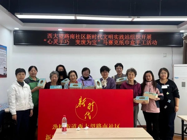 西大望路南社区新时代文明实践站率先拉开活动序幕,一场“巧手改造?废盒新生”马赛克纸巾盒手工活动吸引众多居民参与。活动现场,志愿者先向大家普及环保知识,随后指导居民利用彩色马赛克碎片,对素净的小木盒进行创意装饰。居民们发挥想象,拼贴出星星、花朵、青花瓷等各具特色的图案,原本闲置的木盒摇身一变成为实用又美观的家居饰品。“没想到废品能变成这么精致的物件,既锻炼了动手能力,又感受到环保的意义。”参与活动的居民笑着说道。此次活动以手工制作为载体,让环保理念在实践中深入人心。