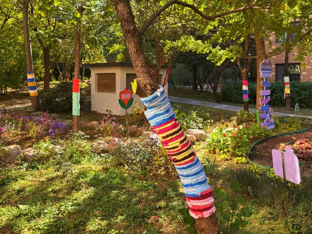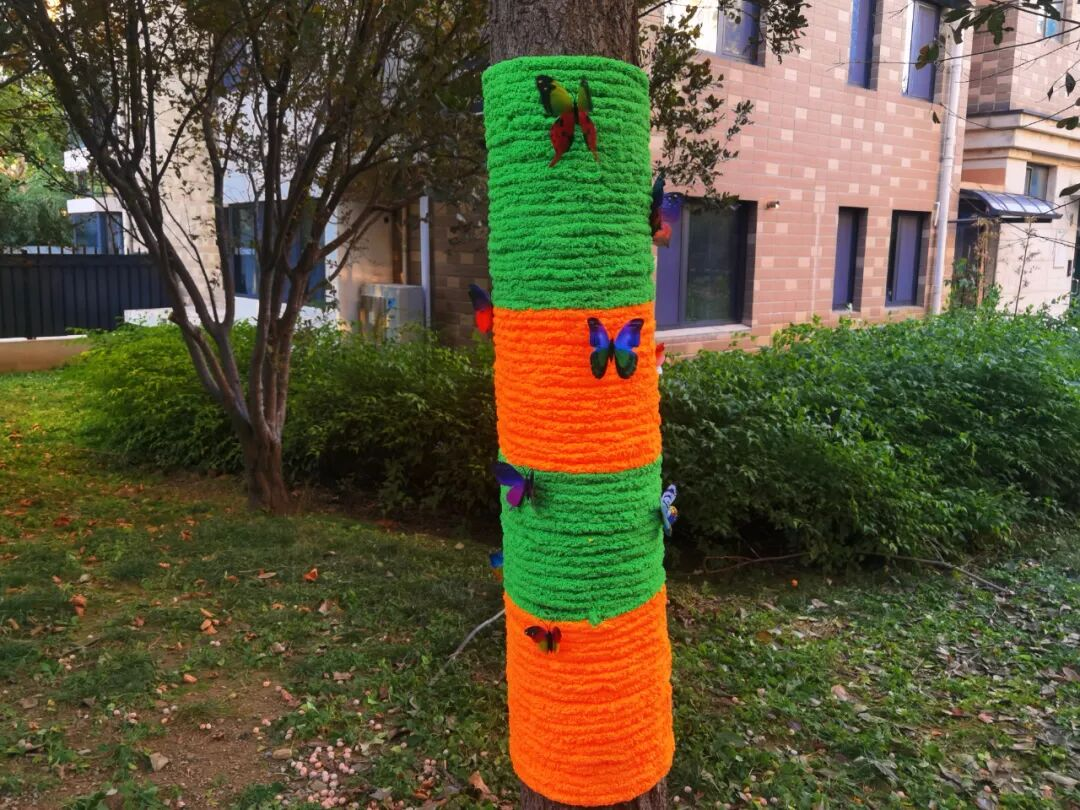 冬日的紫贵庄园小区,树木披上了五彩缤纷的针织“新衣”:粉、白、蓝、紫、绿的毛线层叠交织,点缀着灵动的仿真小鸟;橙绿相间的“外衣”上,蝴蝶饰品翩然欲飞……这充满童趣与暖意的景象,正是滨河街道金谷东园社区“暖冬计划——为小树穿新衣”文明实践活动的生动成果。通过创意护绿,一举实现了树木保暖与社区美化的双重效益。