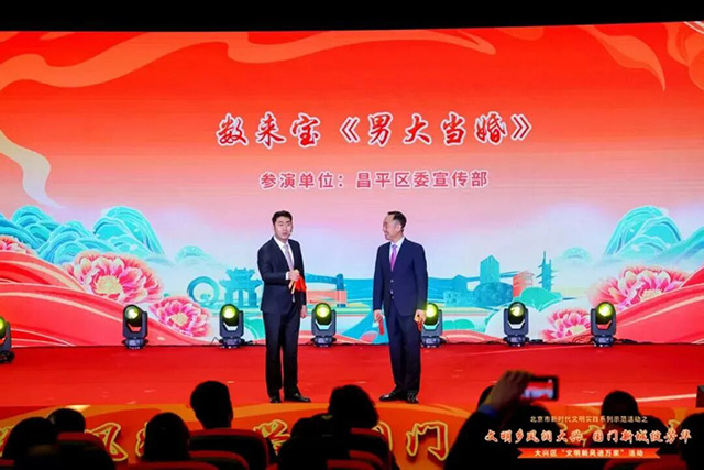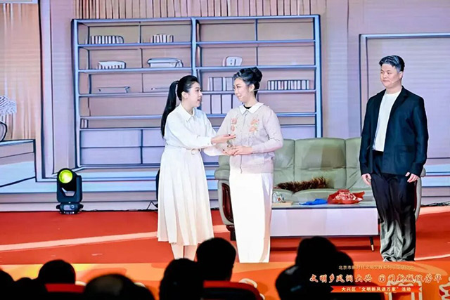 在文艺展演环节,传统艺术与现代文明在方寸舞台间激荡出文明新声。海淀区的皮影戏《悯农》,以传统非遗艺术形式,诠释了“勤俭节约”的中华美德;大兴区创演的小品《生日礼物》,用温情幽默的故事,展现了新时代“厚养薄葬”的文明新风;昌平区的数来宝《男大当婚》与朝阳区的京剧小品《婚姻大事》,以创新的艺术形式,深刻反思高价彩礼、铺张浪费等陋习,倡导“重情轻礼”的文明婚恋观。台上曼舞欢歌喜气洋洋,用精彩表演讲述乡村文明故事,传递新风正气;台下叫好声与鼓掌声交织,移风易俗的种子悄然种下。