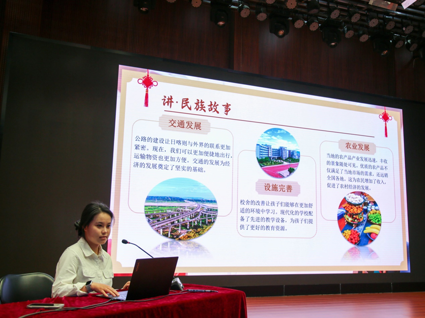 宣讲中,来自新疆的维吾尔族姑娘阿依则巴甫江同学以自身姓名的文化内涵为切入点,深情讲述了父亲 29 年党龄、驻村三年助力叶城县脱贫的感人故事。她通过鲜活事例,生动展现了在党的领导下新疆从贫困落后到繁荣昌盛的巨大变迁,彰显了边疆干部的无私奉献和各族群众的守望相助。姚佳同学则以“血脉相连的共同体情怀”为主题,结合自身成长经历,呈现了不同民族在教育援助、生活互助中的深度交融场景,传递出“铸牢中华民族共同体意识”的时代意义,凸显了党和国家惠民政策对边疆发展的有力支持与坚实保障。