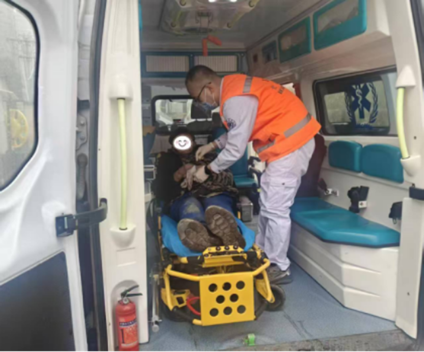 在等待家属的期间,车窗内外是两个世界:窗外春寒料峭,车内暖意融融。医护人员始终守在老人身边,握着他粗糙的手,轻声安抚,密切关注着每一项生命体征的变化,不敢有半点松懈。