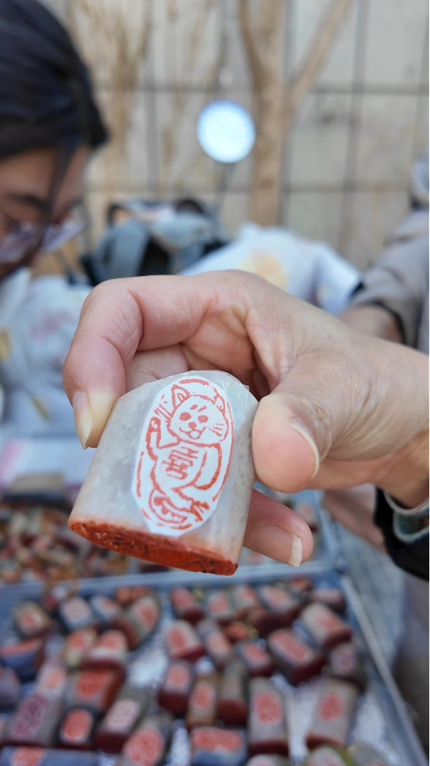 午后的杨梅竹斜街暖意融融,一辆不起眼的小电驴缓缓出现在街角。白发苍苍的老人下了车、就地支起摊位,小猫、小狗、葫芦……各式各样的印章铺满托盘,边上还挂起了“预约定制动物印章须知”。不一会儿,一群年轻人便把小摊围了几圈。