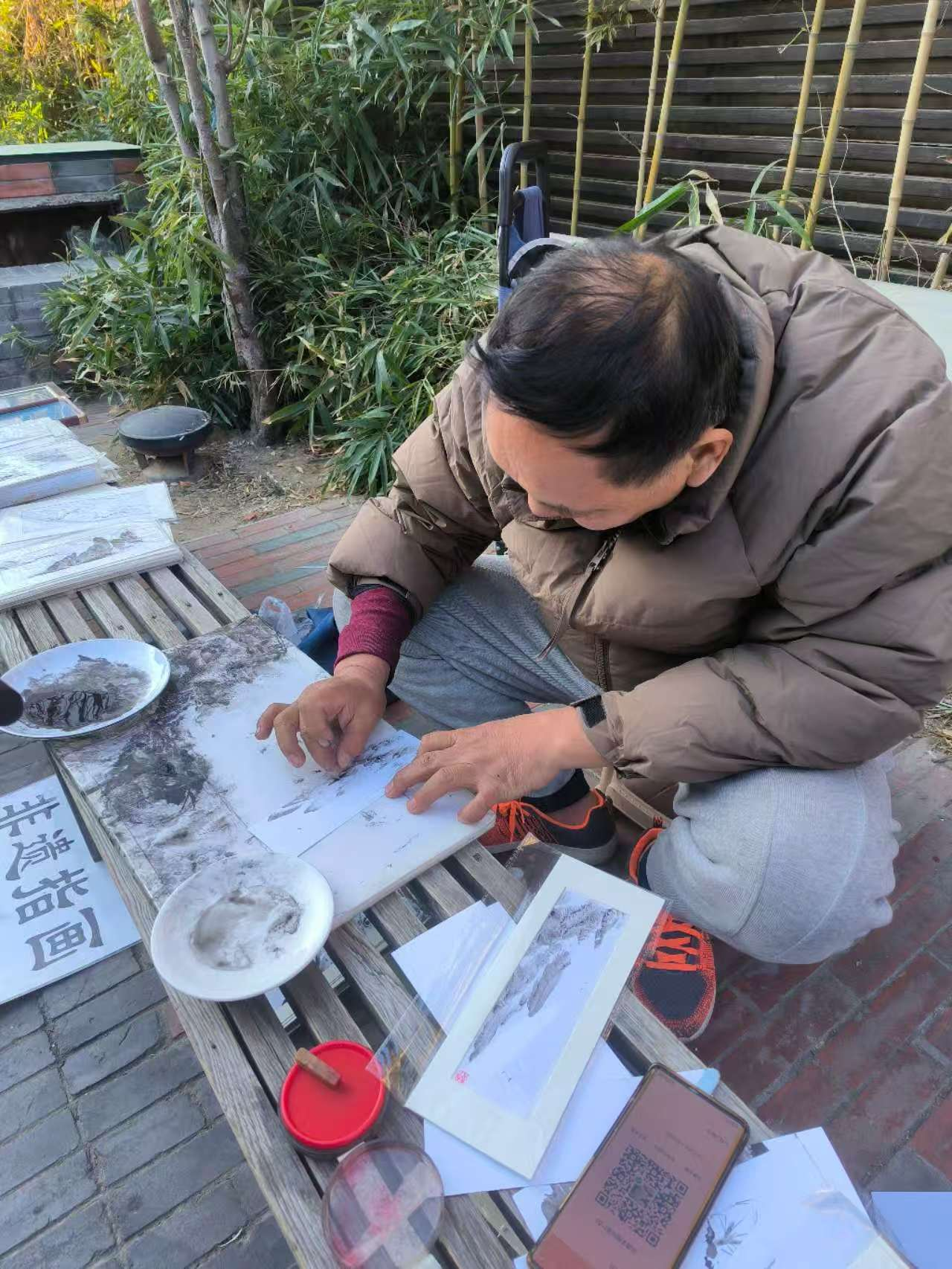 继续深入胡同,更多的手艺人渐次登场。丁杰的指画摊总是围着一圈人,这位退休老人当过22年兵,曾是游泳运动员,研习绘画已有五十余载。此刻,在摊位前,人们只凝神看他那沾满墨汁的手——拇指侧锋一抹,是远山的脊线;食指轻点,近树便有了姿态;掌缘一拖,江水的流动感就在宣纸上晕染开来。不过片刻,一幅烟雨空蒙的山水已在指间诞生。
