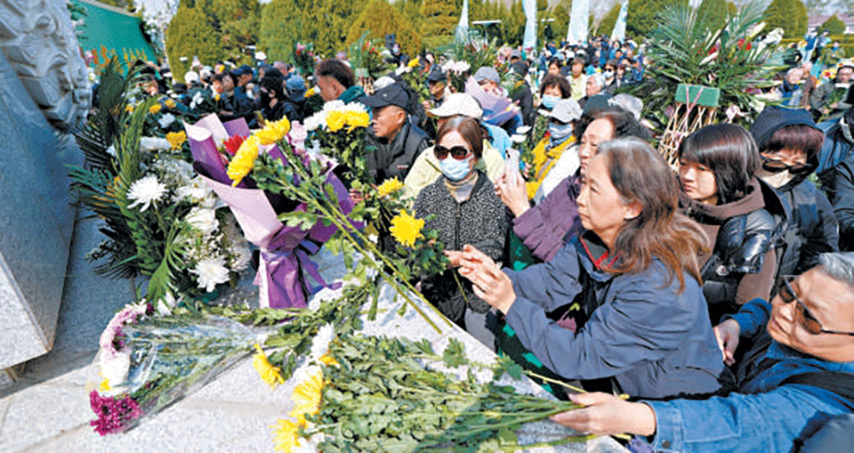 公祭仪式结束后,海葬家属在湖畔播撒花瓣,自然葬家属在树梢系上黄丝带、挂起风铃。
