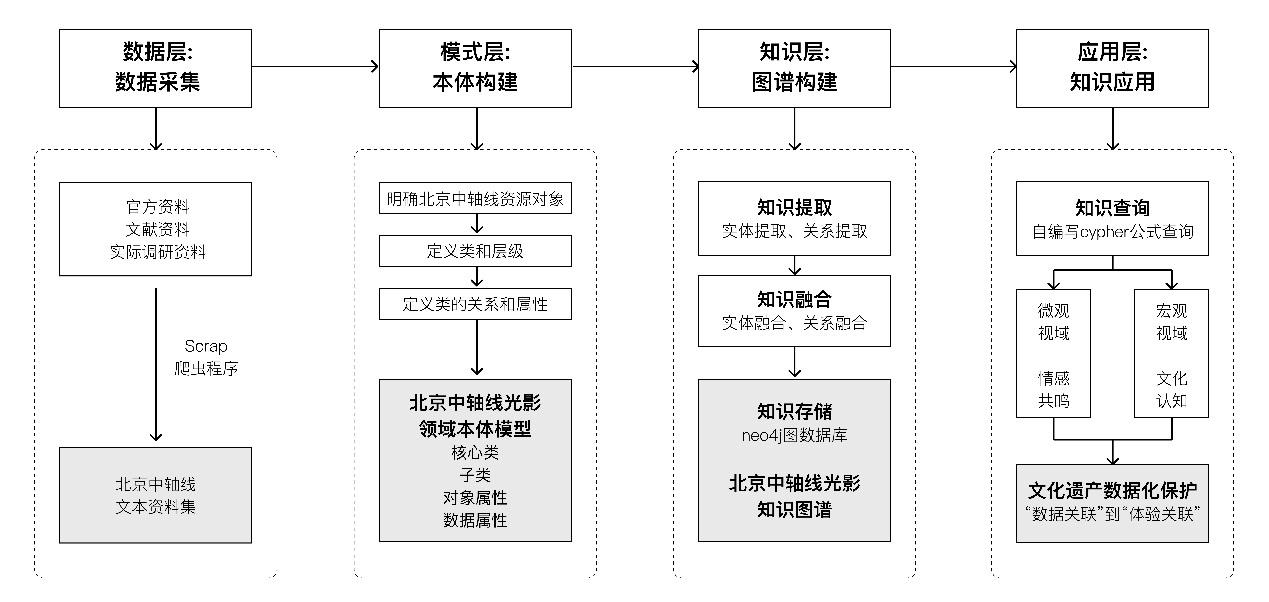 以中轴线光影为例,建立面向文化遗产保护的中轴线光影知识图谱。通过Neo4j图谱整合历史环境光数据、空间拓扑及文化语义,系统解析中轴线光影的时空规律与文化逻辑,技术路线如图所示。