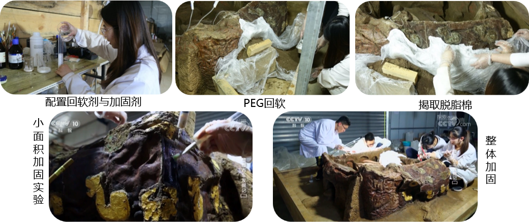 图6 河北行唐故郡东周彩绘髹漆车厢使用三步联用法保护过程