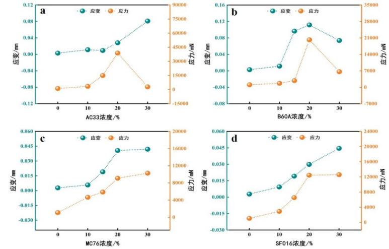 图3 AC33、B60A、MC76、SF016加固剂在不同浓度下加固糟朽漆膜的应力应变曲线