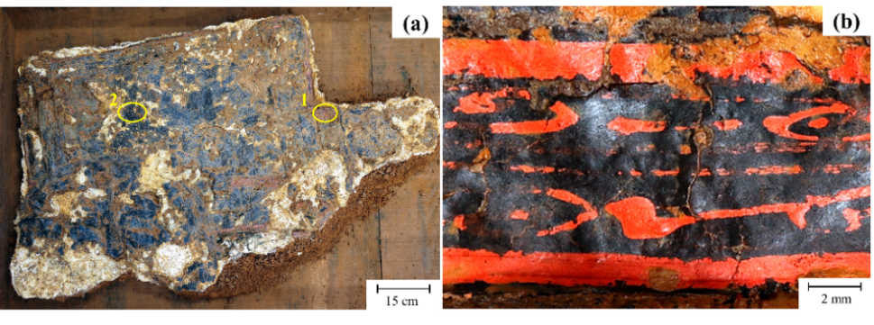 主要结论如下:(1)采用显微观察、扫描电镜-能谱、傅里叶红外光谱、热裂解气相色谱质谱技术、拉曼光谱、X射线衍射和X射线荧光光谱等多种分析手段研究云南罗平圭山汉墓漆膜的保存状态、制作原料与髹漆工艺,对漆膜周围赋存土壤的矿物组成及可溶盐成分进行定性定量分析,探讨漆器成为漆土质遗存的原因。结果表明,圭山M9出土的漆膜成分为中国漆,添加有干性油和淀粉。漆膜髹漆层分为三层,依次为朱漆层、底漆层、漆灰层,厚度分别约为34μm、27μm、125μm,朱漆层与底漆层经过找平处理。朱漆层是大漆掺和红色颜料朱砂调制而成,漆灰层中掺和有黏土。漆膜埋藏土壤为红壤类铁铝土,含有三水铝石、石英、钙长石等矿物。土壤饱和含水率约为30.39%,pH约5.28,可溶盐含量约为0.035%,种类主要为NaCl、NaNO3、Ca(NO3)2·4H2O等。分析认为,罗平圭山高湿酸性土壤环境有利于漆膜保存,但不利于木胎保存。本研究联合多种科技手段对圭山M9出土的漆土质遗存进行初步的科学分析,将为此类考古漆器的保护修复提供科学支撑。