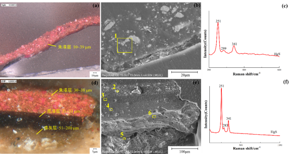 图2 云南罗平圭山汉墓出土漆器漆膜的剖面结构、扫描电镜显微照片与拉曼谱图