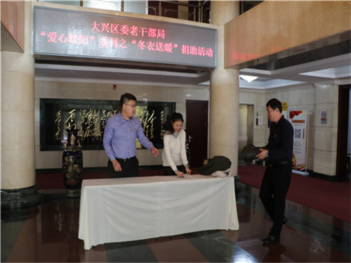 为广泛弘扬救急解难、扶贫济困的传统美德,表达首都市民对灾区、贫困地区群众的关爱之情,根据《大兴区政府办关于开展“爱心暖阳”系列之“冬衣送暖”主题社会捐助活动的通知》精神,大兴区委老干部局于11月12日上午在局一楼大厅集中开展“爱心暖阳”之“冬衣送暖”主题捐助活动,全体干部职工30余人参加活动。