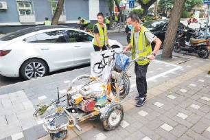 划线时间选在周末的清晨。天微微亮,城市管理办公室工作人员就带着辖区物业人员行动起来,一部分人负责将非机动车挪出划线区域,另一部分人迅速拿着标尺、胶带、划线机器施工……“7月北京正值雨季,我们看了天气预报,中间正好有两天没雨,就起早划线。”杨军剑说,“找准点位后,施工就方便很多,现在科技进步,划线用的材料速干环保,提高了工作效率。”