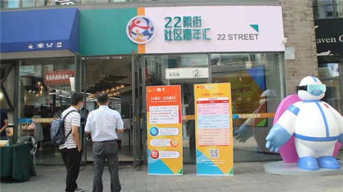 22院街·社区青年汇坐落于朝阳区双井街道百子湾路北京二十二院街艺术区,紧邻今日美术馆。该青年汇门店为上下两层,总面积约320平方米,可同时容纳100余名青年人参观学习。走进该门店,目之所及处处可感受到“青春范儿”,门前一人高的雕像“大白”憨态可掬,墙面布景贴有各类标语,“奋斗的青春最美丽”“有趣的俱乐部、靠谱的朋友圈、开放的大家庭”,室内还设有咖啡区、阅读角、合影墙,供青年人休憩交流、“打卡”拍照。
