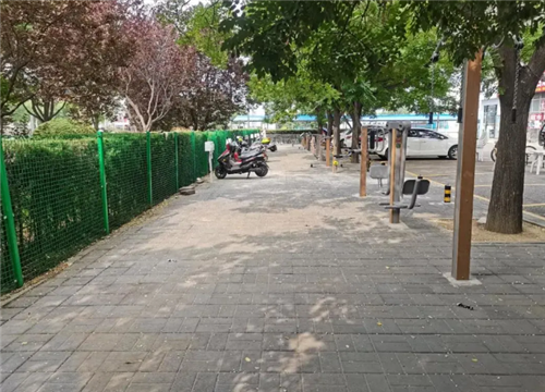 社区为了解决51号楼门店南侧,隔离带里乱扔垃圾、私拉电线、乱停车等问题,增加了绿化带防护网,还安装了电动车充电桩、增设健身器材。社区为了解决西门高峰期堵车问题,确保行人安全,增设了人车分流隔离护栏。
