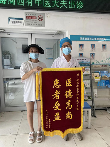 近日,房山区城关街道饶乐府社区卫生服务站丁自强医生,收到患者杨女士赠送的印有“医德高尚 患者受益”字样的锦旗。