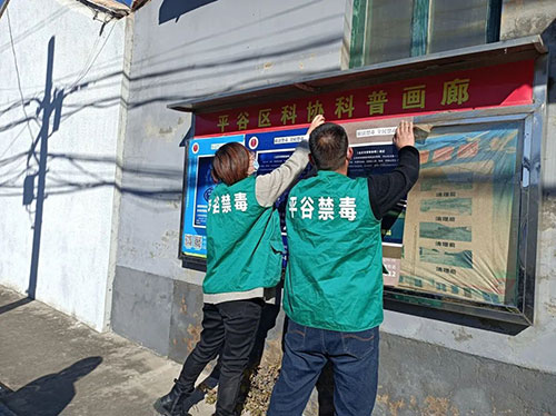 活动中,禁毒社工以及各村治保干部在辖区主要路段、人流量较多的地方以及一些场所的宣传栏等比较醒目的位置张贴海报。通过海报宣传传递禁毒工作信息,增进辖区村民对禁毒工作的了解,海报展示了《北京市禁毒条例》、寄递防毒、毒品种类的外观特点、主要成分和危害。通过禁毒相关知识描述了涉毒给个人、家庭以及社会带来的危害,提高村民的识毒、防毒、拒毒能力,同时让辖区村民更清晰的认识到毒品的危害,远离毒品。