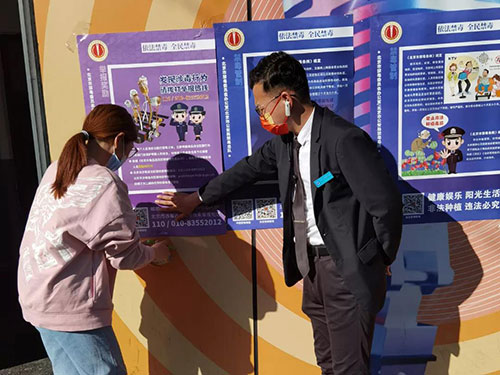 近日,北苑街道平安建设办公室联合北苑派出所,在辖区KTV开展禁毒宣传活动,切实提高娱乐场所从业人员对毒品的认知及防范能力,杜绝公共娱乐场所内涉毒违法犯罪现象的发生。