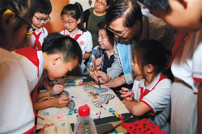 现场,六位非遗大师与孩子们互动交流,教授孩子们尝试体验风筝、剪纸、绳结、毛猴、京剧脸谱、内画鼻烟壶技艺。每个孩子都拿着自己体验制作的非遗作品开心地度过了一个上午。