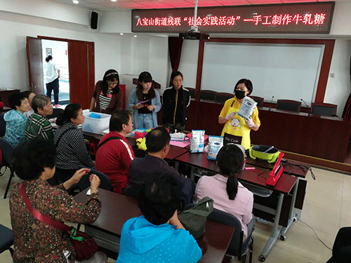 为了丰富残疾人业余生活,在双节到来之际,八宝山街道残联组织辖区残疾人在温馨家园进行社会实践活动---手工制作牛轧糖,参加此次活动有50人。