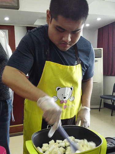 制作老师先为残疾朋友们介绍了制作的过程,首先按比例倒入黄油,融化棉花糖,奶粉拌匀,然后放入熟的花生碎,再放入磨具开始塑形……大家都专心地看着,学习着每一个步骤。拌、擀、切,大家都跃跃欲试。不一会儿,甜蜜的奶油糖香弥漫在空气中。待凉后,切成小块,大家动手一起包装。