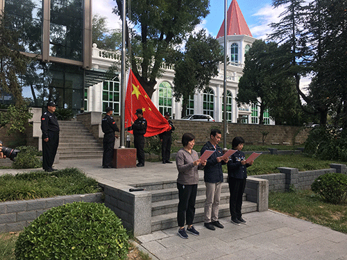 国旗,升起来了!随着朝霞,随着晨风;穿过硝烟,穿过炮声;和阳光一起闪耀,和白鸽一起飞翔!聆听着存建英、张杰、孙浩的诗朗诵,伴随着国歌,五星红旗在电力培训中心的广场上缓缓升起。让大家投放祖国母亲的怀抱,紧贴着国旗腾飞!
