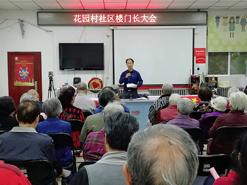 2018年9月29日上午9点,海淀区甘家口街道花园村社区居委会召开了全体楼门长及物业小组会节前动员会,会议中,社区举行了“花园村社区爱国主义教育活动-授旗仪式”。社区居委会主任给大家介绍了升挂国旗的重要意义以及楼门长的作用,大家纷纷表示,一定坚决完成任务。讲话后主任给每一位楼门长授予一面国旗。接过国旗,象征着接过了责任与使命,大家将旗杆紧紧的握在手中举于胸前。随着音乐的响起,参会的75名人员全体起立,一起唱起了中华人民共和国国歌。不少老党员的眼中泛起了泪花。一位参会的老党员张阿姨激动的说:“我们的身体虽然老了,但我们的心不老。无论国家交给我们什么任务,我们都绝对拥护,坚决完成”。