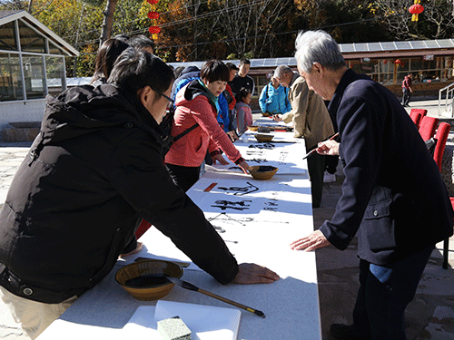 活动当天,书法家们相聚在怀柔区喇叭沟门原始次生林景区,挥毫泼墨、寓笔抒情,现场创作的近百幅作品,赠送给景区游客,并为景区题字创作。